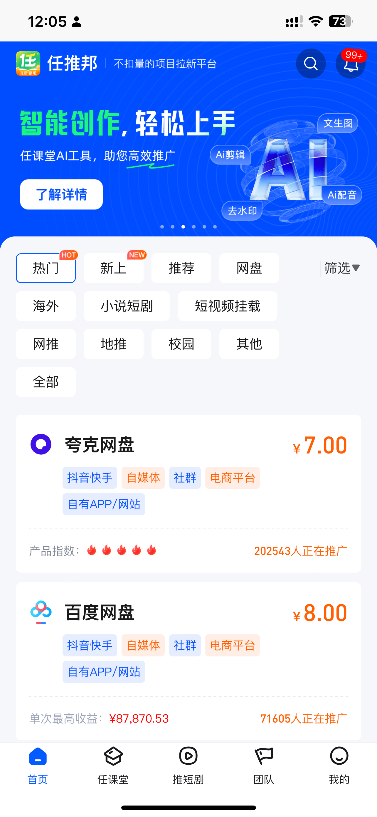 任推邦目前支持百度网盘、夸克网盘、UC网盘等多家主流网盘平台的推广对接,后续会持续增加更多平台支持。